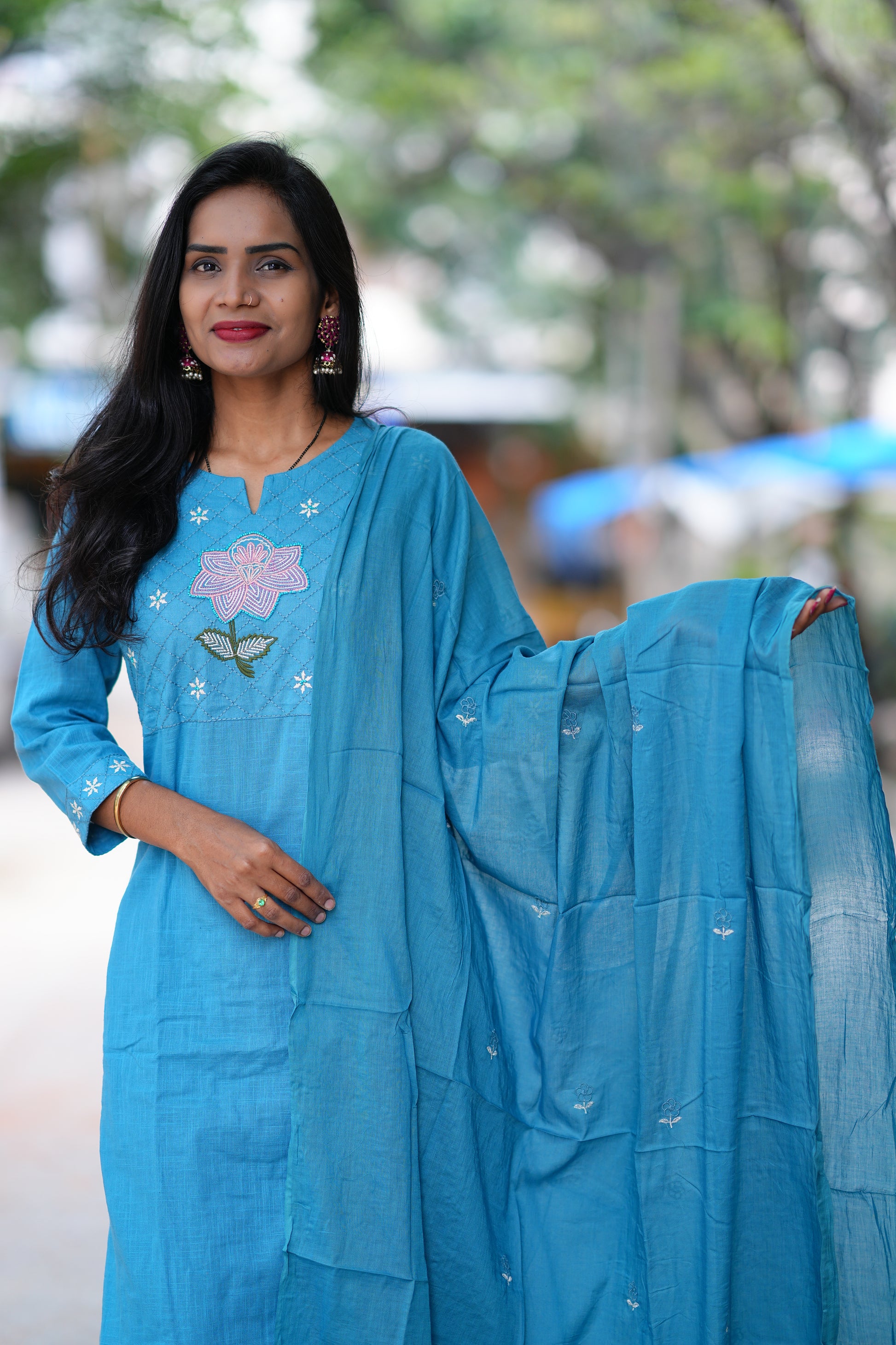 Sky Blue Pure Jaipur Slub Cotton Thread Embriodary 3 Piece Set with Complete Lining