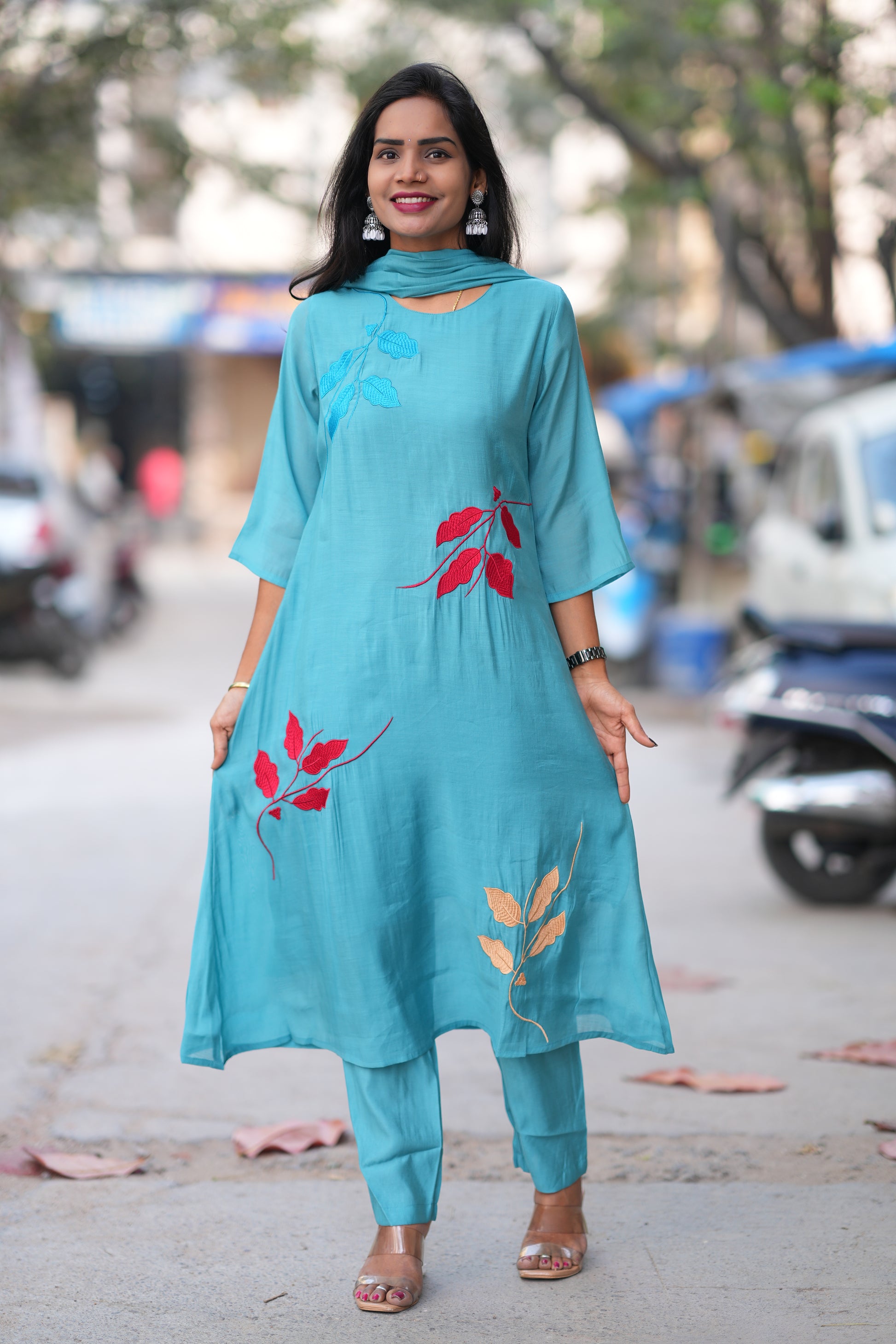 Teal Blue Color Mul Chandheri Designer 3 Piece Set With Complete Lining