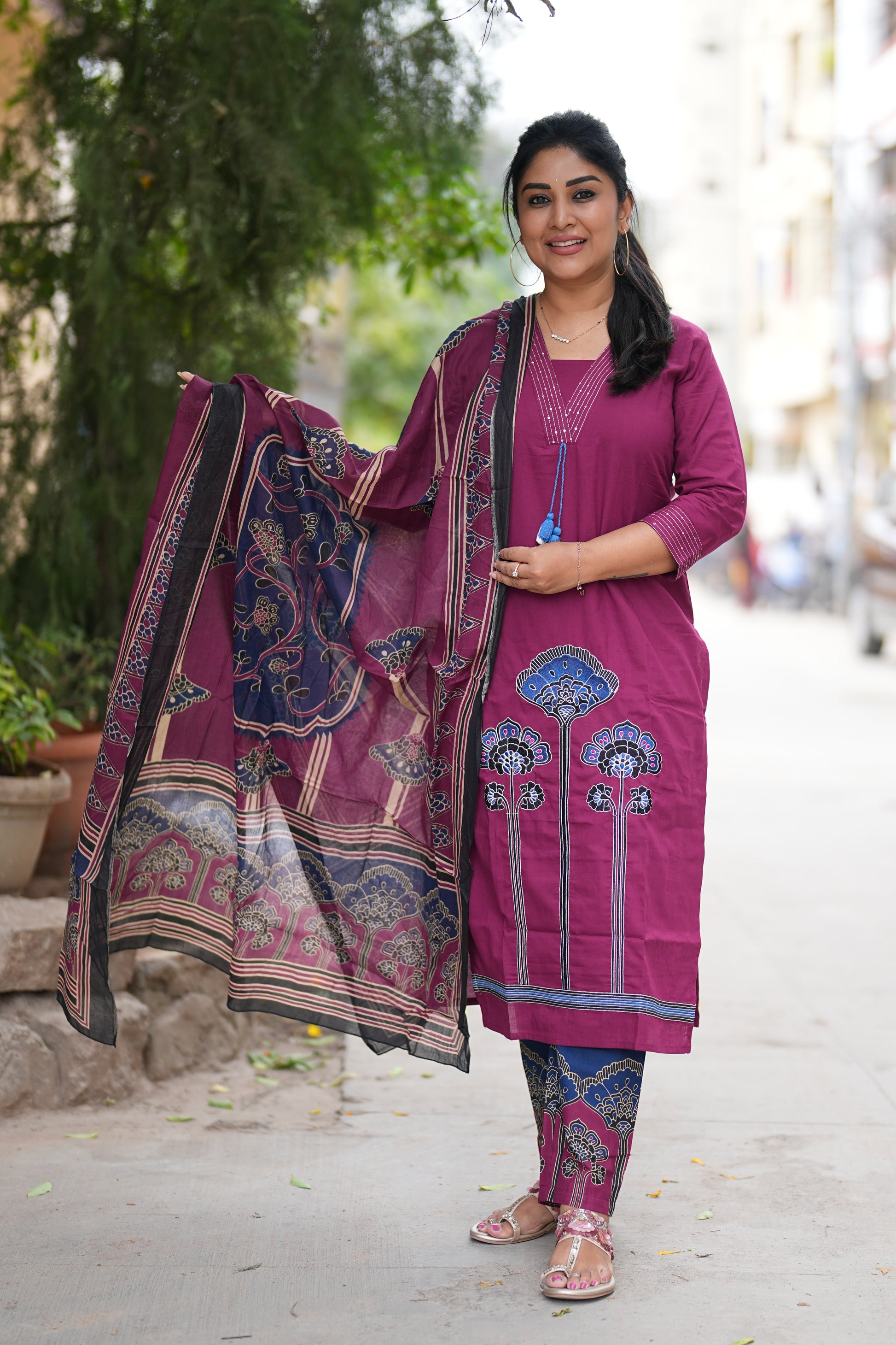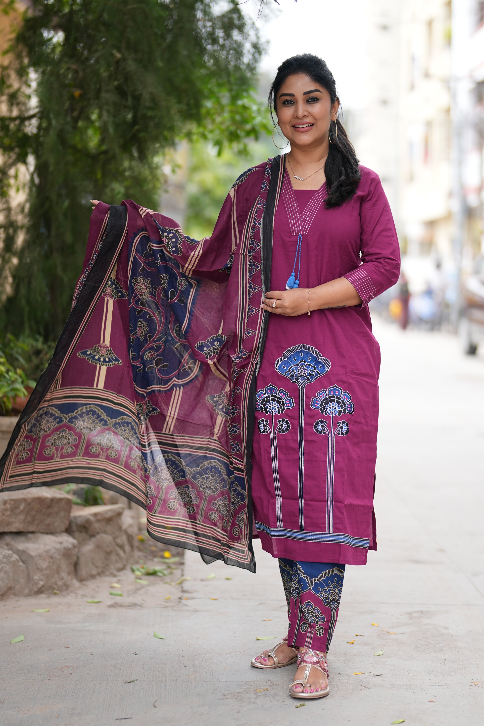 Elevate your ethnic wardrobe with this sophisticated wine magenta three-piece ensemble crafted from pure Jaipur cotton. Designed for semi-formal occasions, this set combines traditional aesthetics with contemporary comfort. The premium cotton fabric ensures breathability and durability, while the included lining provides structure and modest coverage. Perfect for festive gatherings, celebrations, or cultural events, this versatile set offers an elegant silhouette that flatters various body types. The rich wine magenta hue adds depth and richness to your collection, making it a timeless investment piece that transitions seamlessly from day celebrations to evening functions.
