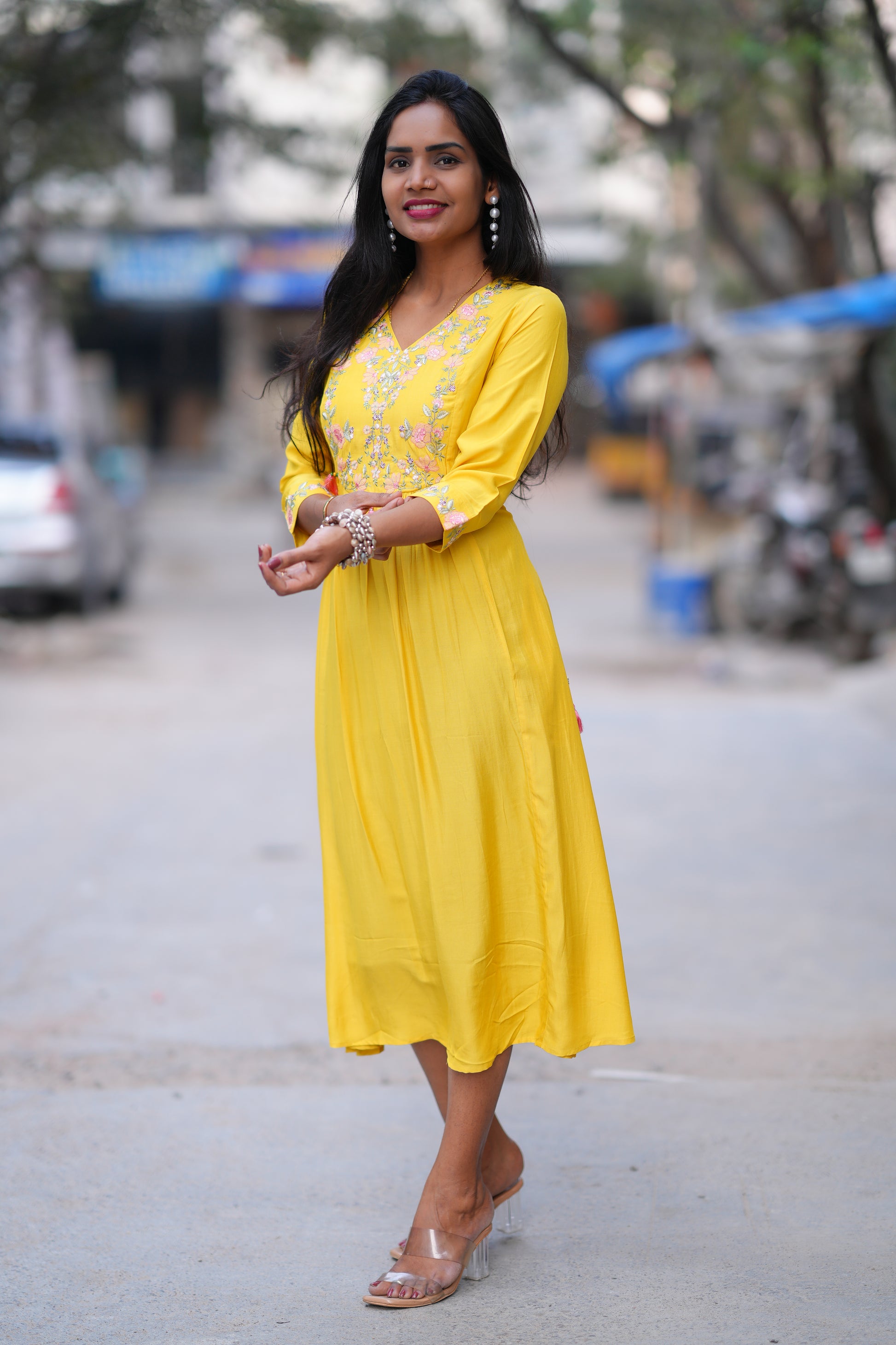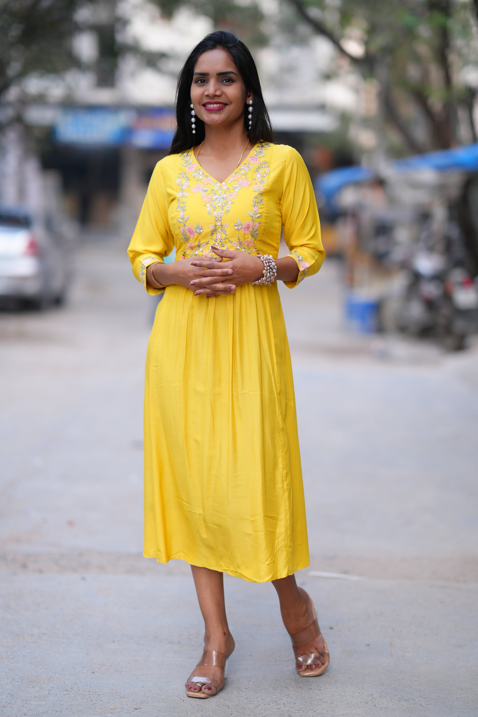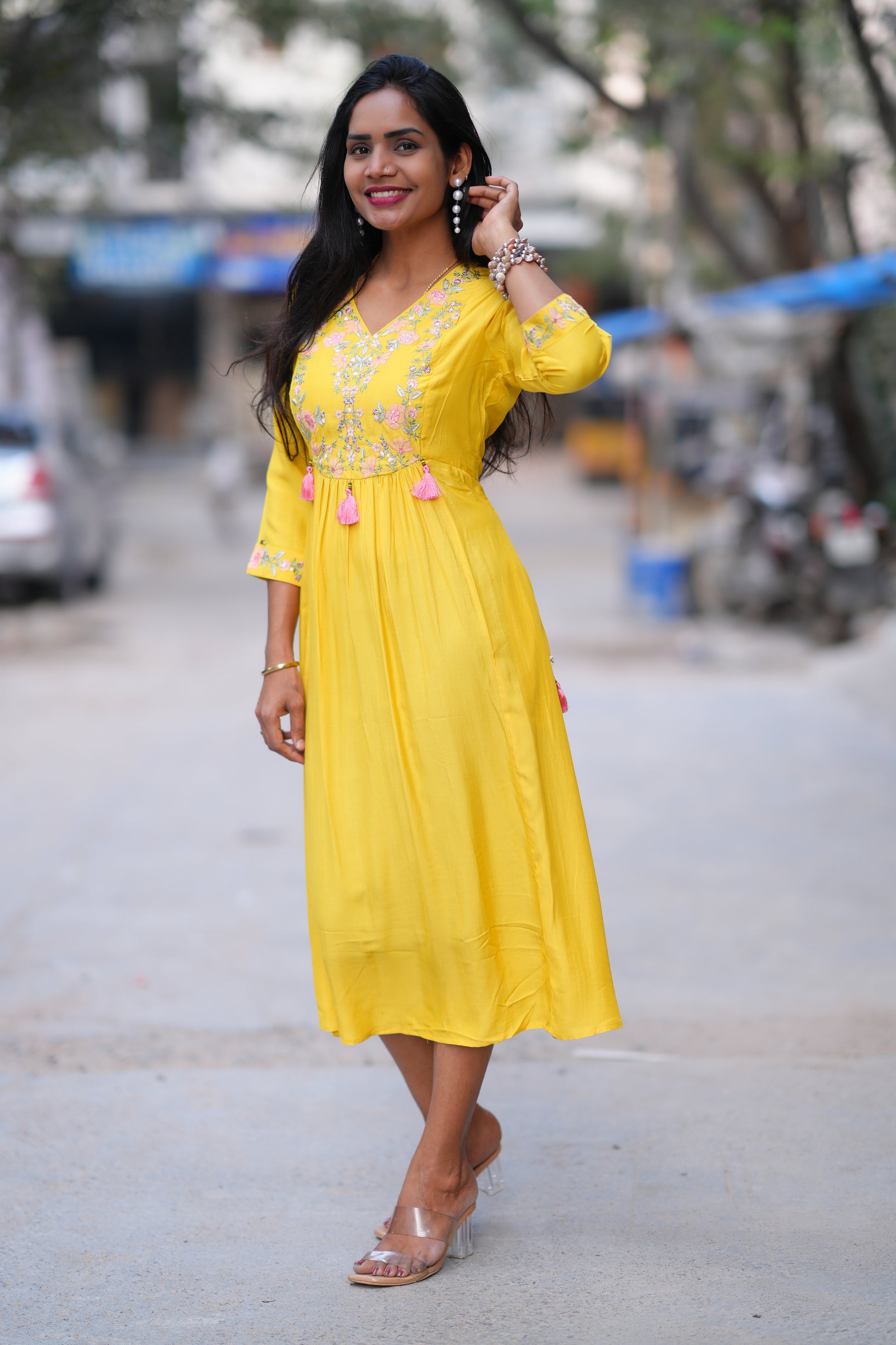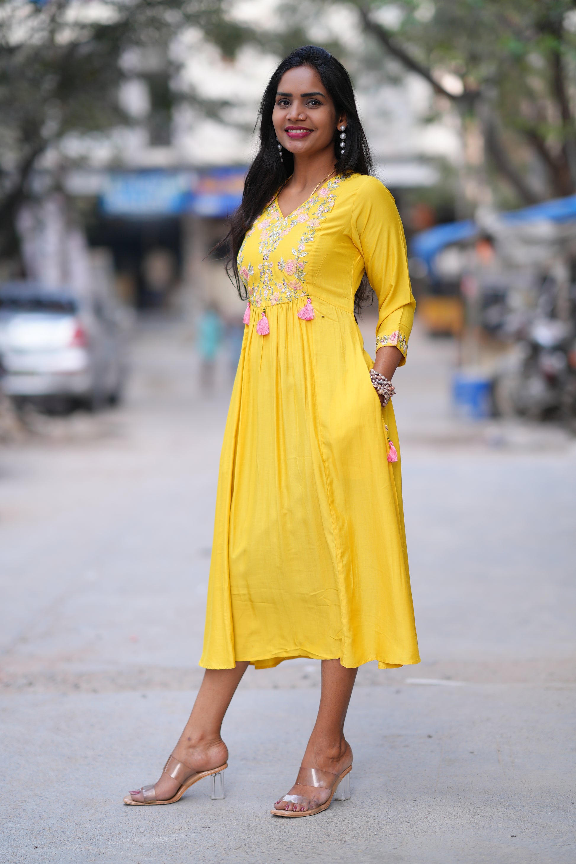 Yellow Color Stylish Frock in Viscose Fabric Elevate your wardrobe with this striking yellow frock, crafted from premium viscose fabric that drapes beautifully and moves with effortless grace. The vibrant hue makes a bold fashion statement while the soft, breathable material ensures all-day comfort. Perfect for casual outings, festive occasions, or professional settings, this versatile piece transitions seamlessly from day to evening wear. The viscose construction offers a luxurious feel against the skin with natural moisture-wicking properties, making it ideal for India's warm climate. A timeless addition to any collection, this frock combines contemporary style with practical elegance.
